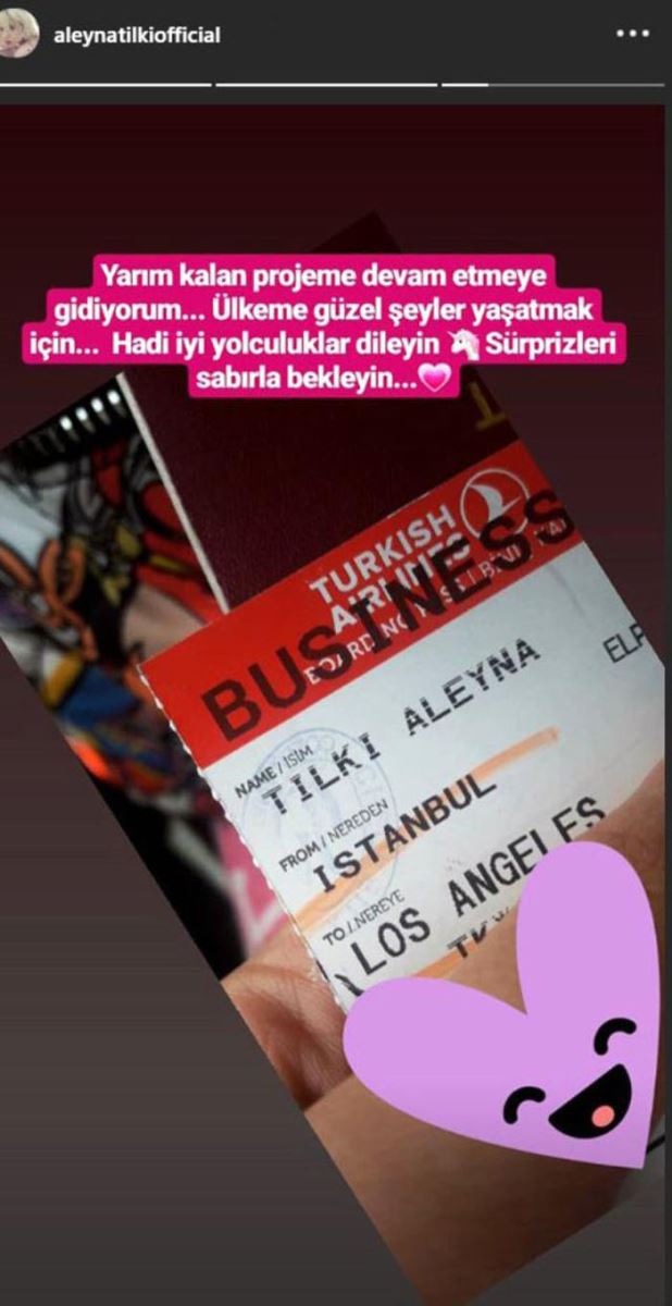 Aleyna Tilki Los Angeles'a gittiğini Instagram hesabından duyurdu. Biletinin fotoğrafını paylaşan Tilki, "Yarım kalan projeme devam etmeye gidiyorum. Ülkeme güzel şeyler yaşatmak için. Hadi iyi yolculuklar dileyin. Sürprizleri sabırla bekleyin" dedi.