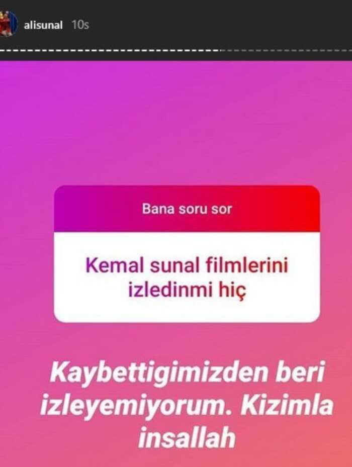 Ali Sunal bir takipçisinden gelen ‘Kemal Sunal filmlerini izledin mi hiç?’ şeklindeki soruya “Kaybettiğimizden beri izleyemiyorum, kızımla inşallah” yanıtını vererek babasının filmleriyle ilgili bir itirafta bulunmuş oldu.