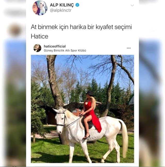 Sosyal medya fenomeni Alp Kılınç ise Hatice'nin ata bindiği fotoğrafı paylaşarak "At binmek için harika bir kıyafet seçimi" yorumunu yaptı.