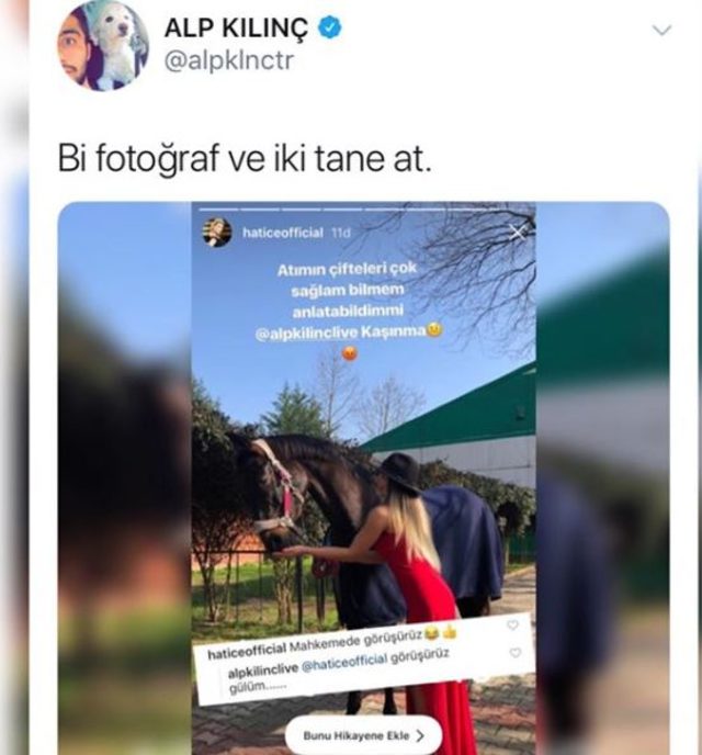 Alp Kılınç daha sonra Instagram hesabından Hatice'nin kendisi için yazdığı "Atımın çifteleri çok sağlam bilmem anlatabildim mi Alp Kılınç kaşınma" paylaşımı yaptı.