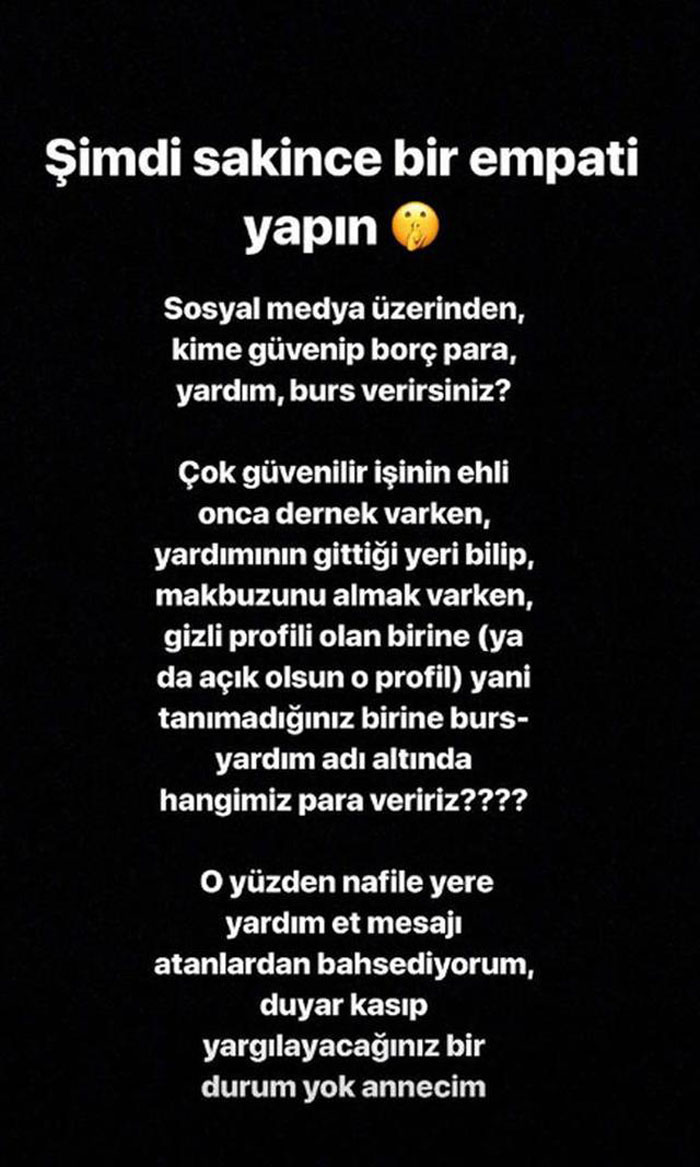 Daha sonra oyuncu sosyal medya üzerinden gelen yardım taleplerini dikkate almadığını belirterek 'Güvenilir dernekler varken neden tanımadığım kişilere para vereyim' dedi.