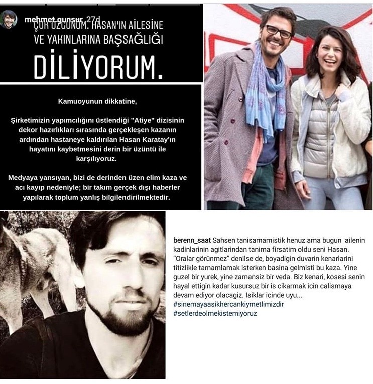 Beren Saat ve Mehmet Günsür, Atiye dizisinin setinde boya işlerini yapan Hasan Karatay'ın geçirdiği kaza sonucu yaşamını yitirmesinin ardından taziye mesajı paylaştı..