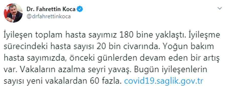 * İyileşen toplam hasta sayımız 180 bine yaklaştı. İyileşme sürecindeki hasta sayısı 20 bin civarında.