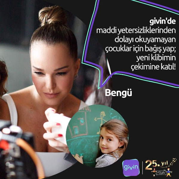 Bengü, ailelerinin maddi yetersizliklerinden dolayı eğitimine devam edemeyen çocuklara destek olmak için, givin mobil uygulaması aracılığıyla 'TOÇEV ile Manevi Ailemiz Projesi’ne bağış yapanlar arasından çekilişle belirlenecek 2 kişiyi, 11 Ocak’ta yeni single projesinin klip çekiminde ağırlayacak.