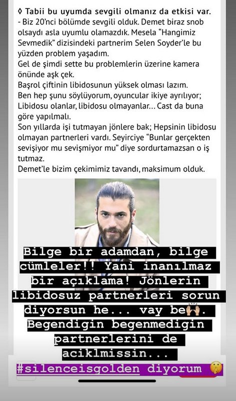 “Biz 20’nci bölümde sevgili olduk. Demet biraz snob olsaydı asla uyumlu olamazdık. Mesela ‘Hangimiz Sevmedik’ dizisindeki partnerim Selen Soyder’le bu yüzdem problem yaşadım. Gel de şimdi sette bu problemlerin üzerine kamera önünde aşk çek. Başrol çiftinin libidosunun yüksek olması lazım. Ben hep şunu söylüyorum, oyuncular ikiye ayrılıyor; Libidosu olanlar, libidosu olmayanlar… Cast da buna göre yapılmalı. Son yıllarda işi tutmayan jönlere bak; Hepsinin libidosu olmayan partnerleri vardı. Seyirciye “Bunlar gerçekten sevişiyor mu sevişmiyor mu” diye sordurtamazsan o iş tutmaz. Demet’le bizim çekimimiz tavandı, maksimum olduk.”