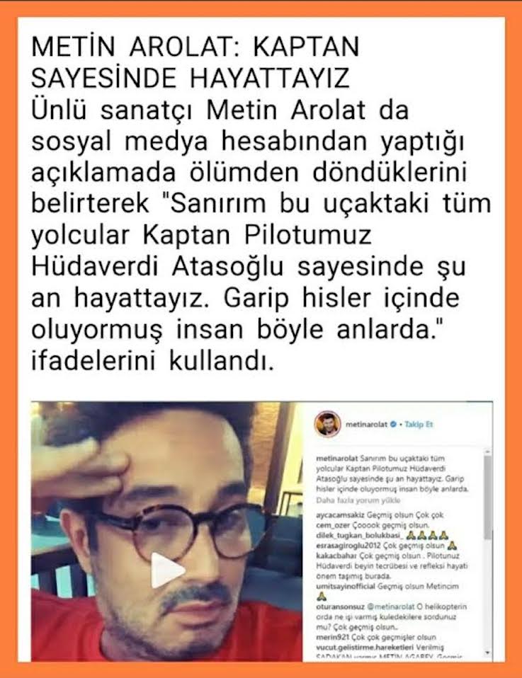 Uçakta bulunan şarkıcı Metin Arolat atlatılan tehlike sonrası, olayı hemen sosyal medya hesabından duyurdu...