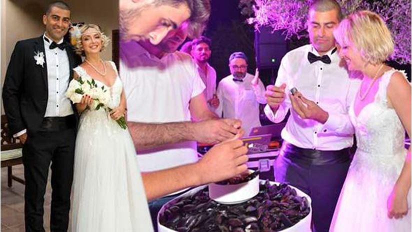 Can Bonomo-Öykü Karayel ve Ege gibi birçok ünlü ismin de katıldığı düğünün en şaşırtıcı detayı, düğün pastası yerine büyük bir midye dolma tepsisinin masaya konması oldu.