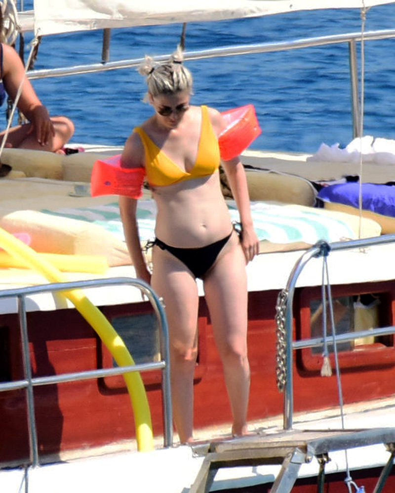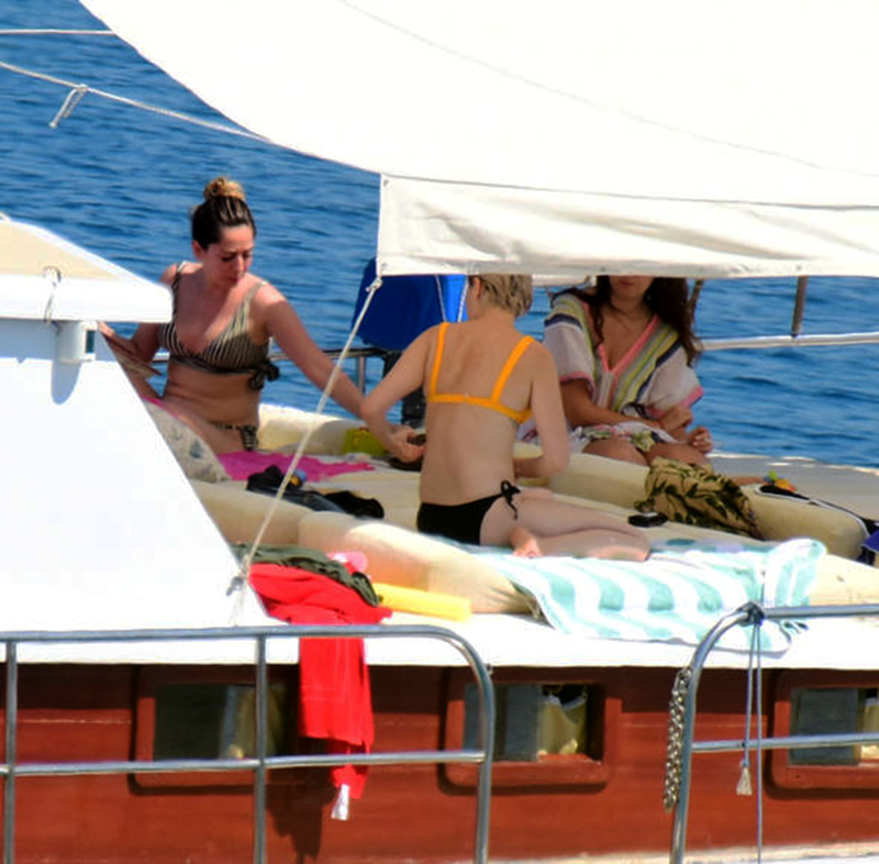 Deniz kolluğuyla yüzen Burcu Binici, tekneye döndükten sonra üstsüz güneşlendi.