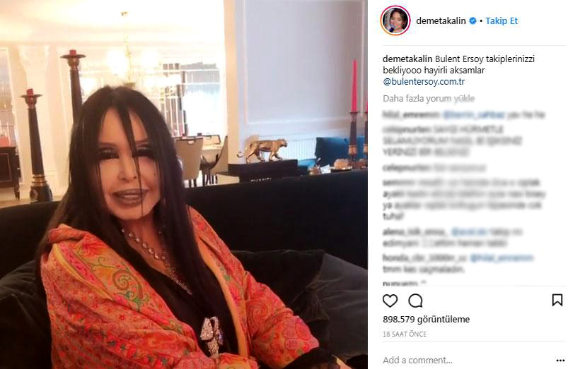 Demet Akalın ise Bülent Ersoy'un Instagram hesabı açtığını paylaştığı videoyla duyurdu. Bülent Ersoy'un konuştuğu bir videoyu takipçileriyle paylaşan Demet Akalın, "Bülent Ersoy takiplerinizi bekliyor, hayırlı akşamlar" dedi.