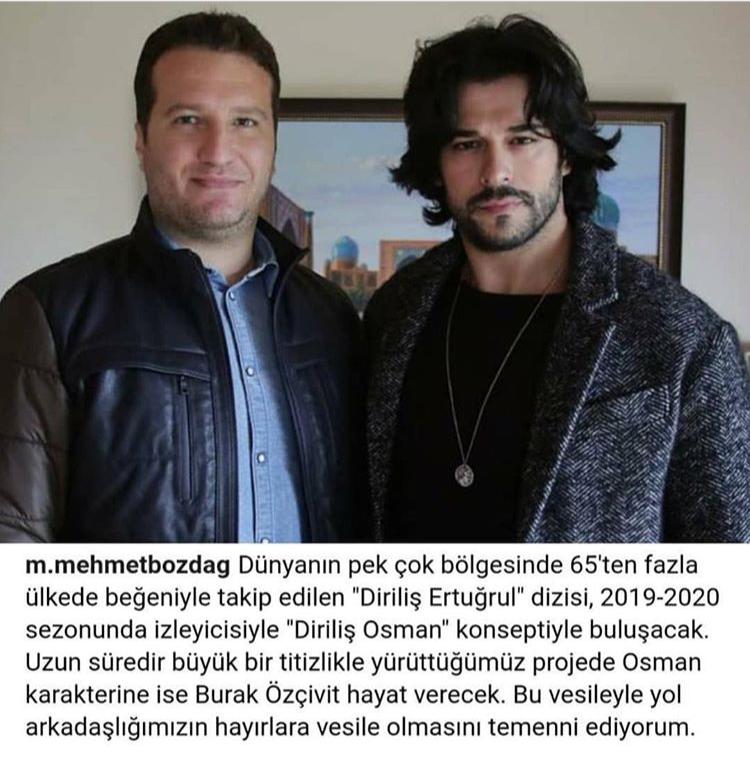 Konuyla ilgili sosyal medya hesabından açıklama yapan senarist Mehmet Bozdağ, ‘Uzun süredir büyük bir titizlikle yürüttüğümüz projede Osman karakterine Burak Özçivit hayat verecek. Bu vesileyle yol arkadaşlığımızın hayırlara vesile olmasını temenni ediyorum.’ dedi.