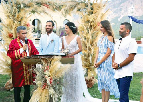 Piu Events’in organizasyonuyla düzenlenen düğün törenine Gökçe Bahadır, Ceyda Düvenci, Bülent Şakrak, Leyla Lydia Tuğutlu, Şebnem Bozoklu gibi birçok ünlü isim katıldı. Konuklar, Ayvalık’tan özel olarak bu düğün için gelen Tezgah grubunun şarkılarıyla eğlendi.