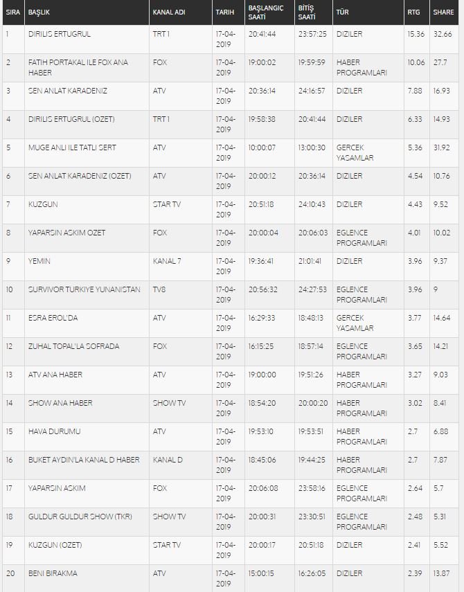 18 Nisan reyting sonuçlarına göre ilk sıra yine Diriliş Ertuğrul'un oldu. FOX Ana Haber reyting sıralamasında ikinci olurken, Sen Anlat Karadeniz üçüncü oldu. Kuzgun yedinci sırada yer aldı. Survivor reyting sıralamsında kendine onuncu sırada yer buldu. Total reytinglerde ilk 20 sıra…