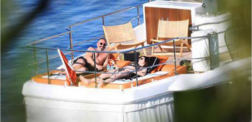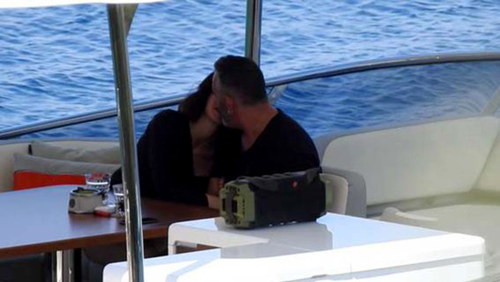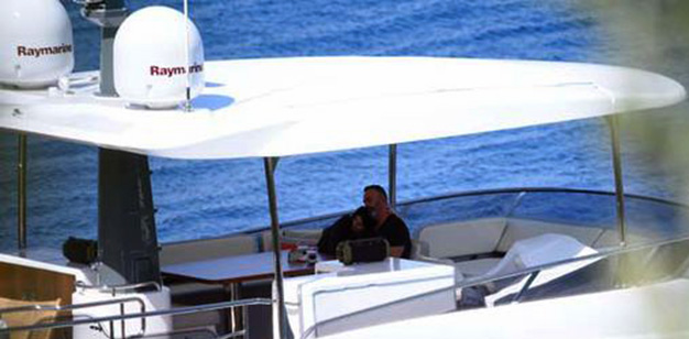 Cennet Koyu’na demir atan teknenin üst kısmında müzik eşliğinde sohbet eden ikiliden Samyeli, bir ara Yılmaz’ın omzuna kafasını koydu.