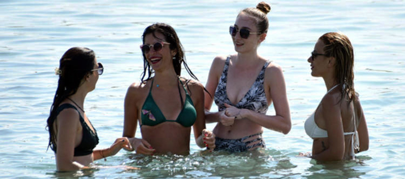 Bir haftadır Çeşme'de olan ve hafta sonu çocukluk arkadaşlarıyla birlikte bir beache giden Ural, önce güneşlendi sonra da serinlemek için denize girdi.
