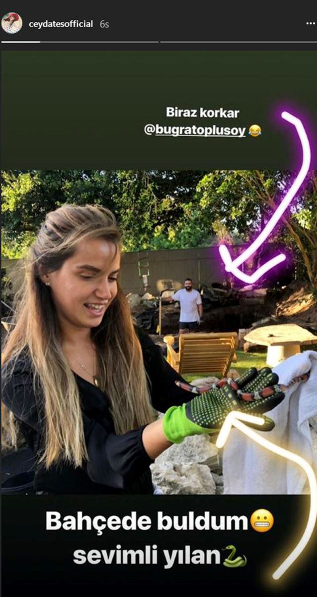 Sevgilisi Buğra Toplusoy’la birlikte yaşadığı evlerinin bahçesini düzenleyen Ceyda Ateş burada bulduğu yılanı eline alarak bir de fotoğraf çekti.