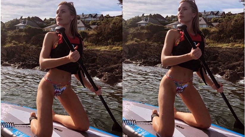 Arkadaşlarıyla birlikte sörf tahtası üzerine binen ve kürek çeken Chole bir anlık heyecanın sonunda başına açtığı derdi Instagram hesabından paylaştı.