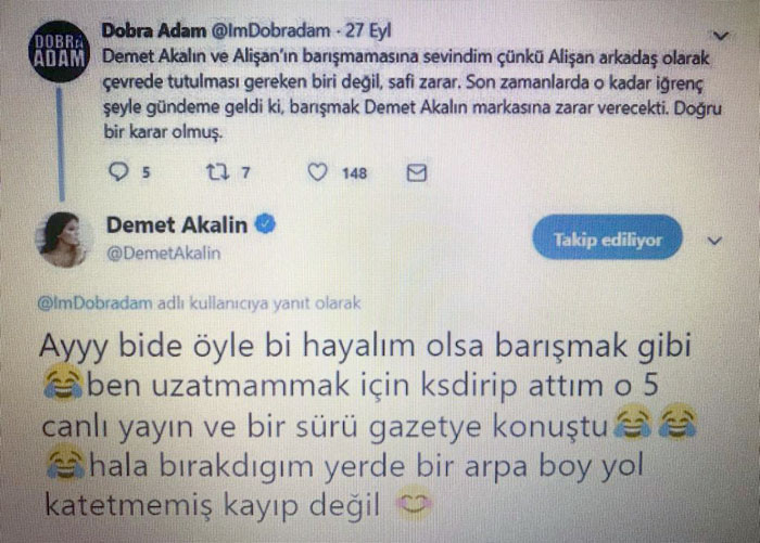 Bu açıklamanın ardından bir takipçisi Demet Akalın'a, "Alişan'la barışmamana sevindim" diye yazdı. Demet Akalın ise şu cevabı verdi: ''Hayalim olsa barışmak gibi, ben uzatmamak için kestirip attım. O canlı yayın ve gazeteye konuştu. Hala bıraktığım yerde bir arpa yol katetmemiş, kayıp değil."