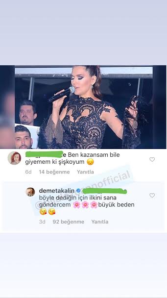 Demet Akalın, sayfasında yılbaşına özel 10 takipçisine elbise hediye edeceğinin müjdesini verdi. Takipçisi “Ben kazansam bile giyemem ki şişkoyum” dedi. . Demet Akalın bu yoruma “ Böyle dediğin için ilkini sana göndercem büyük beden “ yazdı.