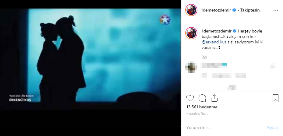 Bugün final bölümüyle son kez ekranlara gelecek olan 'Erkenci Kuş'un yıldızı Demet Özdemir, sosyal medya hesabından duygusal bir paylaşımda bulundu. Özdemir, Yaman ile bir fotoğrafını paylaşarak "Her şey böyle başlamıştı...Bu akşam son kez 'Erkenci Kuş' sizi seviyorum iyi ki varsınız..." notunu düştü. Güzel oyuncunun bu duygusal paylaşımına dizinin fanlarından da yorum yağdı.