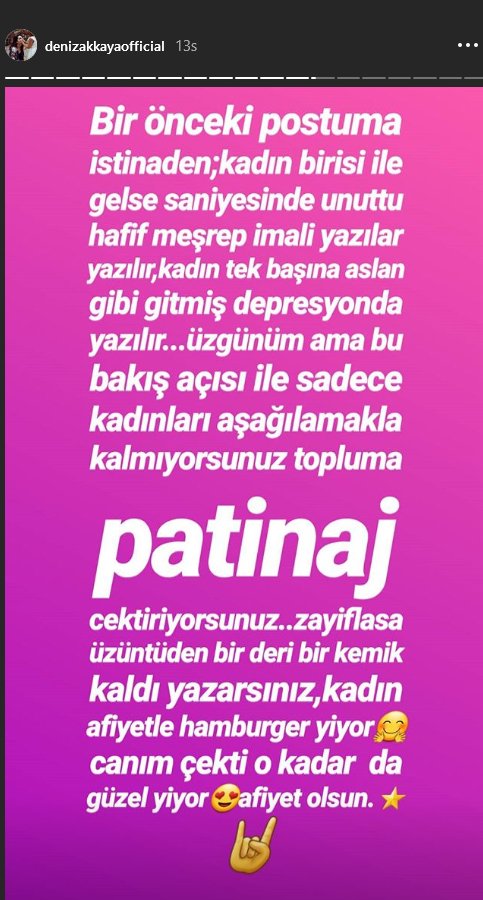 Akkaya, hesabından yazdığı satırlarda şu ifadelere yer verdi: “Bir önceki postuma istinaden, kadın birisi ile gelse saniyesinden unuttu hafif meşrep imalı yazılar yazılır, kadın tek başına aslan gibi gitmiş depresyonda yazılır… Üzgünüm ama bu bakış açısı ile sadece kadınları aşağılamakla kalmıyorsunuz topluma patinaj çektiriyorsunuz. Zayıflasa üzüntüden bir deri bir kemik kaldı yazarsınız, kadın afiyetle hamburger yiyor canım çekti o kadar güzel yiyor, afiyet olsun”