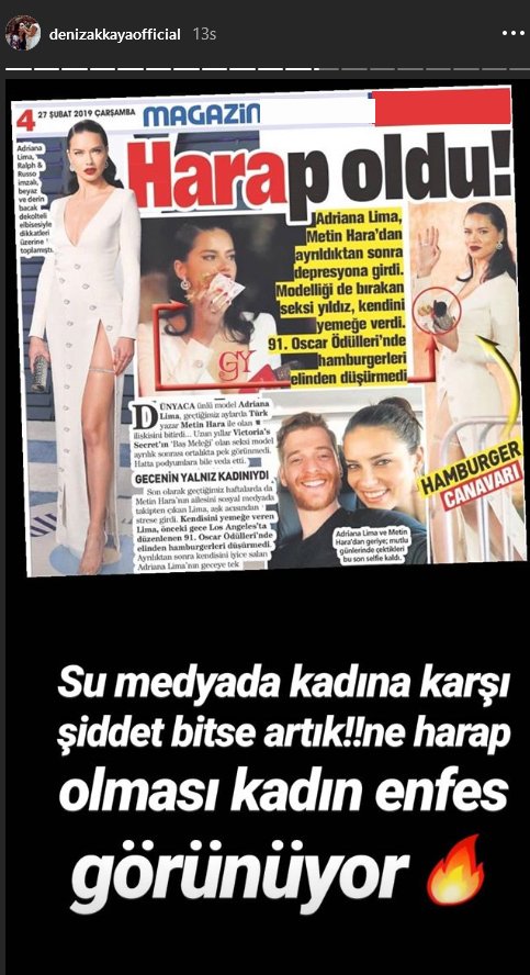 Geceyle ilgili konuşulan bir başka görüntü de Adriana Lima’nın büyük bir afiyetle hamburger yediği anlardı… İşte o görüntüler bir gazetenin magazin sayfasında aşk acısına gönderme yapılarak ‘HARAp oldu’ başlığıyla verilince eski model Deniz Akkaya’dan tepki gecikmedi. Gazete kupürünü hesabından paylaşan Akkaya, sert tepki gösterdi ve ikinci bir paylaşımda bulundu.