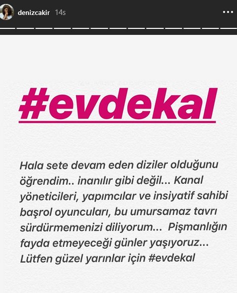 Oyuncu Deniz Çakır, sosyal medya hesabı üzerinden yaptığı paylaşımla 'evde kal' çağrısı yaparken bir yandan da halen çekimleri devam eden dizilerle ilgili birkaç söz söyledi.