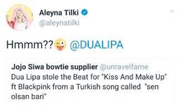 Aleyna Tilki'nin hayranları Dua Lipa'yı 'hırsızlıkla' suçlarken Aleyna ise önce haberi 'Hmm?' notu ile paylaştı.