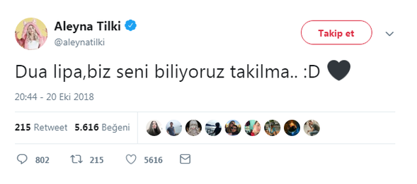 Ardından da "Dua Lipa, biz seni biliyoruz. Takılma" diye tweet attı. Bu arada Aleyna'nın şarkısın da Ed Sheeran'ın geçen yıla damga vuran parçası 'Shape Of You'dan esinlenildiği iddia edilmişti.