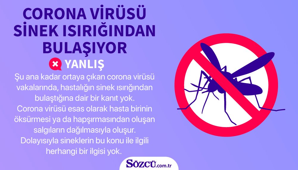 Şu ana kadar ortaya çıkan corona virüsü vakalarında, hsatalığın sinek ısırığından bulaştığına dair bir kanıt yok. Corona virüsü esas olarak hasta birinin öksürmesi ya da hapşırmasından oluşan salgıların dağılmasıyla oluşur. Dolayısıyla sineklerin bu konu ile ilgili herhangi bir ilgisi yok.