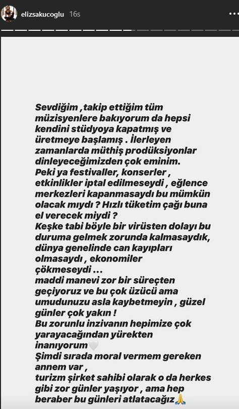 Sosyal medya hesabından spor salonunda yaptığı çalışmaları paylaşan Eliz Sakuçoğlu bu defa dünyayı etkisi altına alan salgın hakkında dikkat çekici bir paylaşımda bulundu.