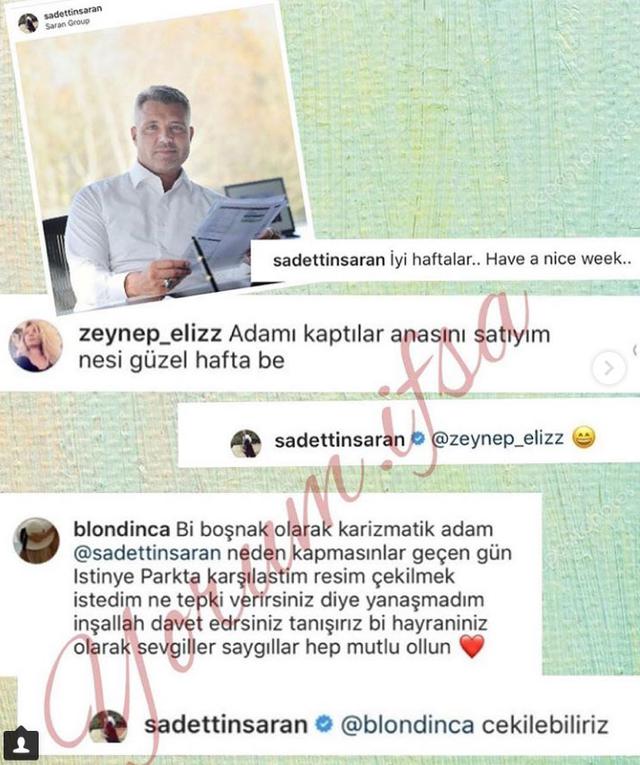 Saran, ''Bir Boşnak olarak karizmatik adam. Neden kapmasınlar! Geçen gün İstinye Park'ta karşılaştım; resim çekilmek istedim, ne tepki verirsiniz diye yanaşmadım. İnşallah davet edersiniz tanışırız. Bir hayranınız olarak sevgiler, saygılar! Hep mutlu olun" yorumunu yapan takipçisine de "Çekilebiliriz" yorumuyla güldürdü.