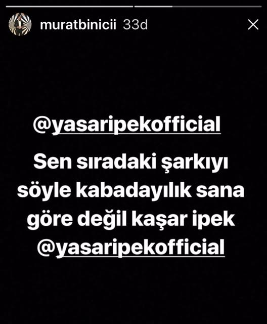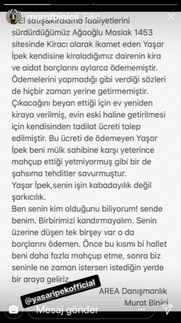 Gayrimenkul danışmanı Murat Binici, gazeteci Bilal Özcan’a da gönderdiği yukarıdaki açıklamanın yanı sıra Yaşar İpek’e, “Sen sıradaki şarkıyı söyle, kabadayılık sana göre değil” diyerek ikinci bir çağrı da daha bulundu ve onu da instagram hesabının story bölümünden paylaştı.