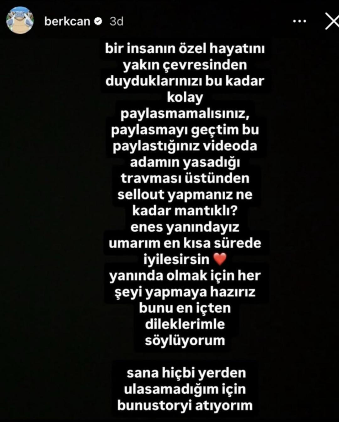 "Paylaşmayı geçtim, bu paylaştığınız videoda adamın yaşadığı travması üstünden sellout yapmanız ne kadar mantıklı? Enes yanındayız, umarım en kısa sürede iyileşirsin. Yanında olmak için her şeyi yapmaya hazırız, bunu en içten dileklerimle söylüyorum. Sana hiçbir yerden ulaşamadığım için bunu story olarak atıyorum.”