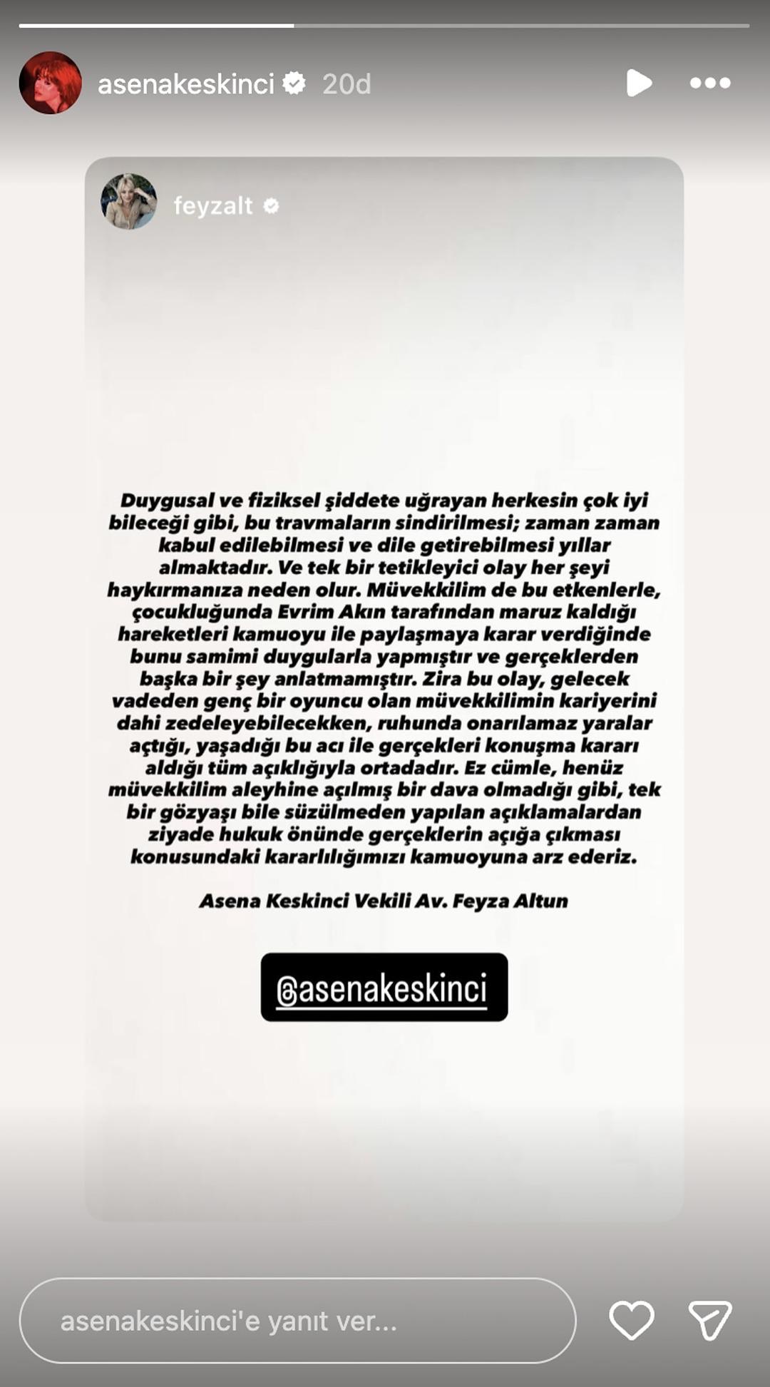 Duygusal ve fiziksel şiddete uğrayan herkesin çok iyi bileceği gibi, bu travmaların sindirilmesi; zaman zaman kabul edilebilmesi ve dile getirilebilmesi yıllar almaktadır. Ve tek bir tetikleyici olay her şeyi haykırmanıza neden olur. Müvekkilim de bu etkenlerle, çocukluğunda Evrim Akın tarafından maruz kaldığı hareketleri kamuoyu ile paylaşmaya karar verdiğinde bunu samimi duygularla yapmıştır ve gerçeklerden başka bir şey anlatmamıştır. Zira bu olay, gelecek vadeden genç bir oyuncu olan müvekkilimin kariyerini dahi zedeleyebilecekken, ruhunda onarılamaz yaralar açtığı, yaşadığı bu acı ile gerçekleri konuşma kararı aldığı tüm açıklığıyla ortadadır. Ez cümle, henüz müvekkilim aleyhine açılmış bir dava olmadığı gibi, tek bir gözyaşı bile süzülmeden yapılan açıklamalardan ziyade hukuk önünde gerçeklerin açığa çıkması konusundaki kararlılığımızı kamuoyuna arz ederiz.