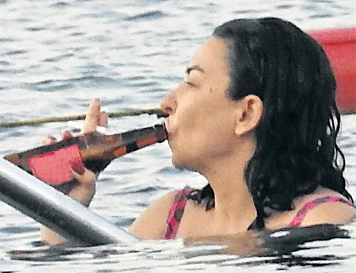 Bitez Sarnıç Beach’te görüntülenen Fatma Turgut bir elinde sigara diğerinde birayla denize girdi.