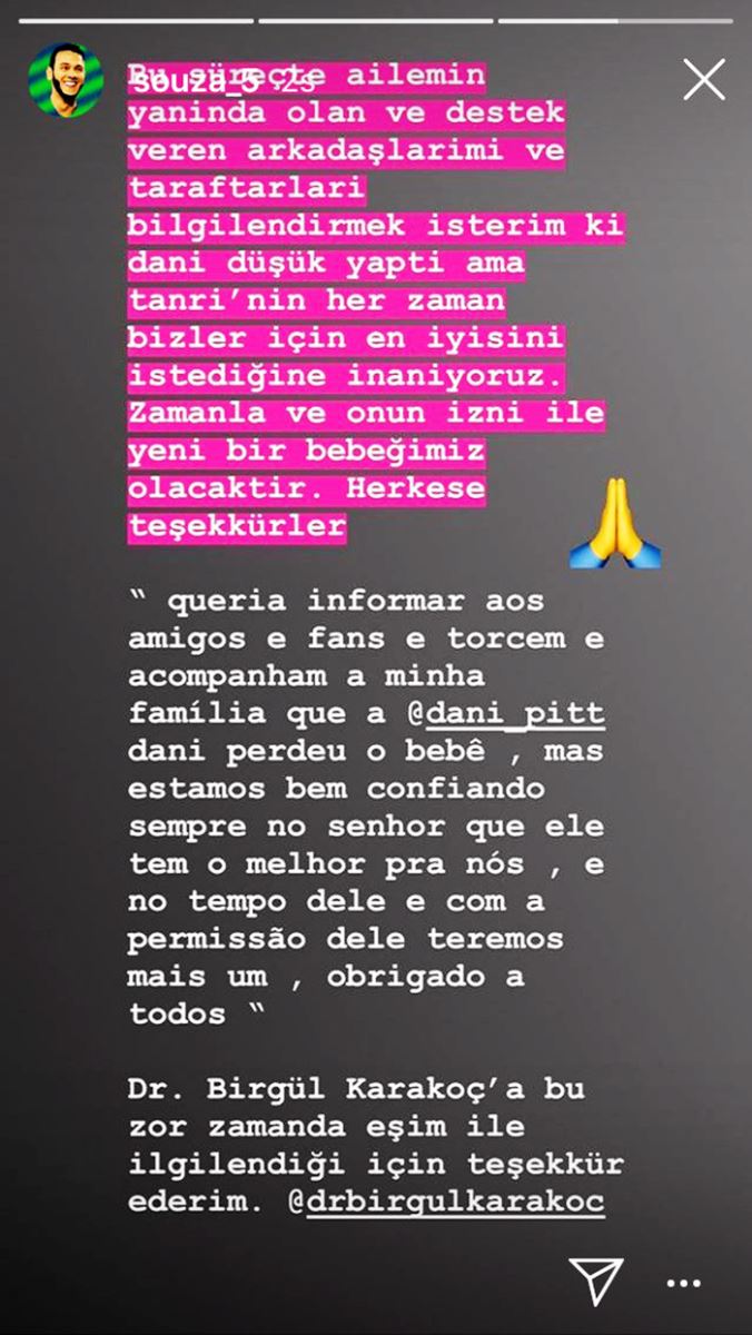 Fenerbahçe'nin Brezilyalı oyuncusu Josef de Souza, hamile olan eşi Danielle Araujo'nun düşük yaptığını sosyal medya hesabından açıkladı.