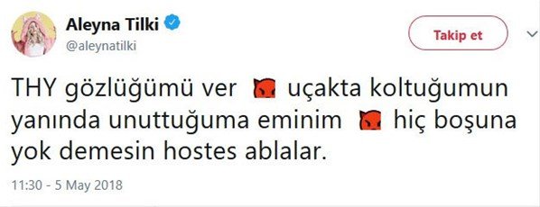 Aleyna Tilki, reşit olduktan sonra ardı ardına konserlere çıkan ve yasaklı olduğu dönemin acısını çıkartan 18 yaşındaki Aleyna Tilki, sosyal medya hesabından yaptığı paylaşımlarla kimi zaman saç baş yolduruyor. Özgürlükten dem vuran ve sürekli olarak yaptığı paylaşımlarında özgür olduğunu söyleyen Aleyna Tilki yaptığı son paylaşımla bu defa okların hedefini hosteslere çevirdi.