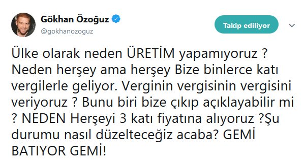 “Ülke olarak neden ÜRETİM yapamıyoruz? Neden her şey ama her şey bize binlerce katı vergilerle geliyor. Verginin vergisinin vergisini veriyoruz? Bunu biri bize çıkıp açıklayabilir mi? NEDEN her şeyi 3 katı fiyatına alıyoruz? Şu durumu nasıl düzelteceğiz acaba?