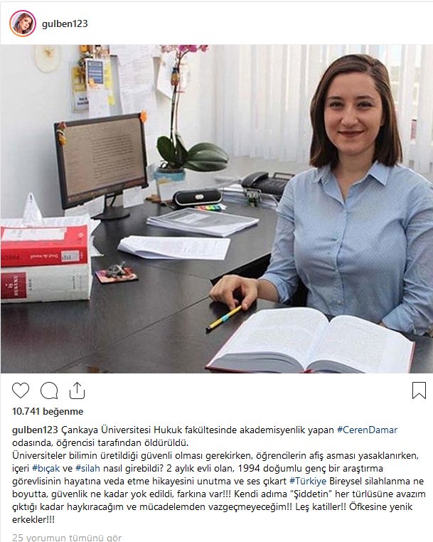 Ergen öldürülen Damar’ın fotoğrafını hesabından paylaştı ve altına da şunları yazdı: “Üniversiteler bilimin üretildiği güvenli olması gerekirken, öğrencilerin afiş asması yasaklanırken, içeri bıçak ve silah nasıl girebildi? 2 aylık evli olan, 1994 doğumlu genç bir araştırma görevlisinin hayatına veda etme hikayesini unutma ve ses çıkart Türkiye! Bireysel silahlanma ne boyutta, güvenlik ne kadar yok edildi, farkına var! Kendi adıma “Şiddetin” her türlüsüne avazım çıktığı kadar haykıracağım ve mücadelemden vazgeçmeyeceğim! Leş katiller! Öfkesine yenik erkekler!”