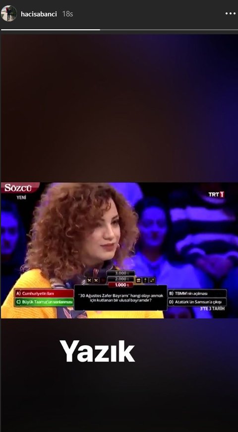 Yarışmacının verdiği yanıttan hareketle yakın tarihinden bu kadar habersiz yaşanmasına sosyal medya kullanıcıları büyük tepki verirken, bir tepki de Hacı Sabancı’dan geldi. Instagram hesabından yarışma görüntüsünü paylaşan Sabancı bu görüntünün üzerine ‘Yazık’ notunu düştü.