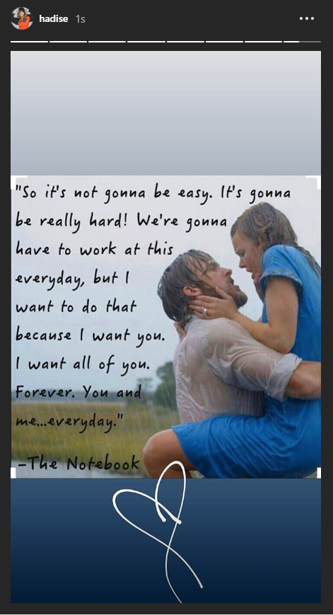 Hadise ise son hamlesiyle adeta iddiaları yalanladı. Şarkıcı, ünlü bir aşk filminden İngilizce olarak, "Kolay olmayacak. Gerçekten zor olacak! Bu konuda her gün çalışmak zorundayız, ama bunu yapmak istiyorum çünkü seni istiyorum. Sana ait olan her şeyi istiyorum. Sonsuza dek. Sen ve ben ... Her gün" sözlerini paylaştı. Hadise'nin bu paylaşımı aşk ilanı olarak yorumlandı.