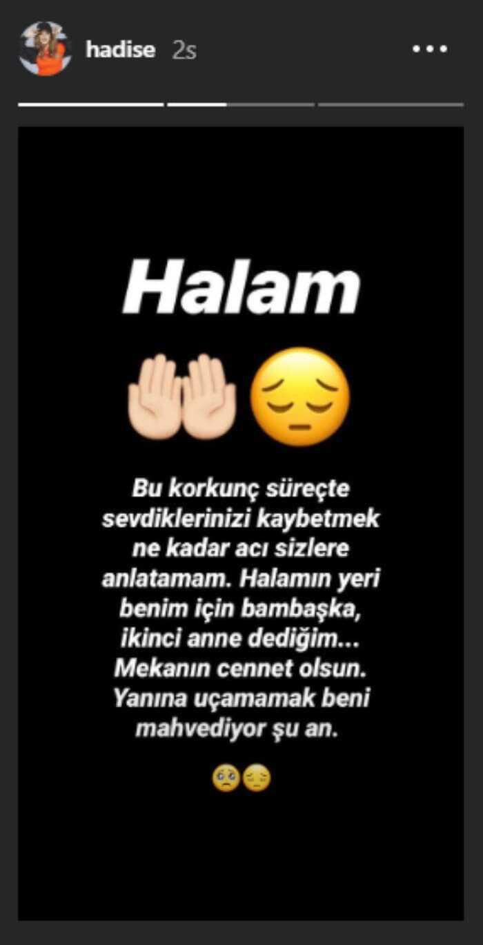 Acı haberi sosyal medya hesabından takipçileriyle paylaşan Hadise, "Bu korkunç süreçte sevdiklerinizi kaybetmek ne kadar acı sizlere anlatamam. Halamın yeri benim için bambaşka, ikinci anne dediğim... Mekanın cennet olsun. Yanına uçamamak beni mahvediyor şu an." dedi.