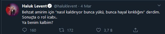 Fenomen dizi Behzat Ç. ye göndermede bulunan Haluk Levent şu ifadeleri kullandı: “Behzat amirim için ‘nasıl kaldırıyor bunca yükü, bunca hayal kırıklığını’ derdim. Sonuçta o rol icabı! Ya benim kalbim?”