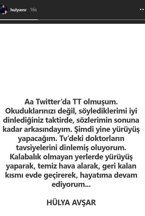Hülya Avşar akşam saatlerinde Instagram hesabından bir paylaşımda bulundu ve sözlerinin arkasında durduğunu söyleyerek kendisinin gün boyunca konuşulmasına şaşırdığını belirtti.