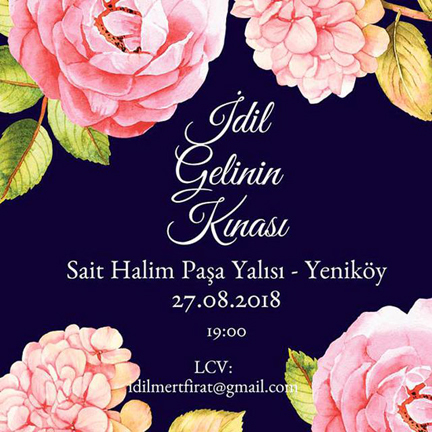 Çiçek desenli mavi renkli davetiyenin üzerinde, ‘İdil Gelinin Kınası’ yazıyor.