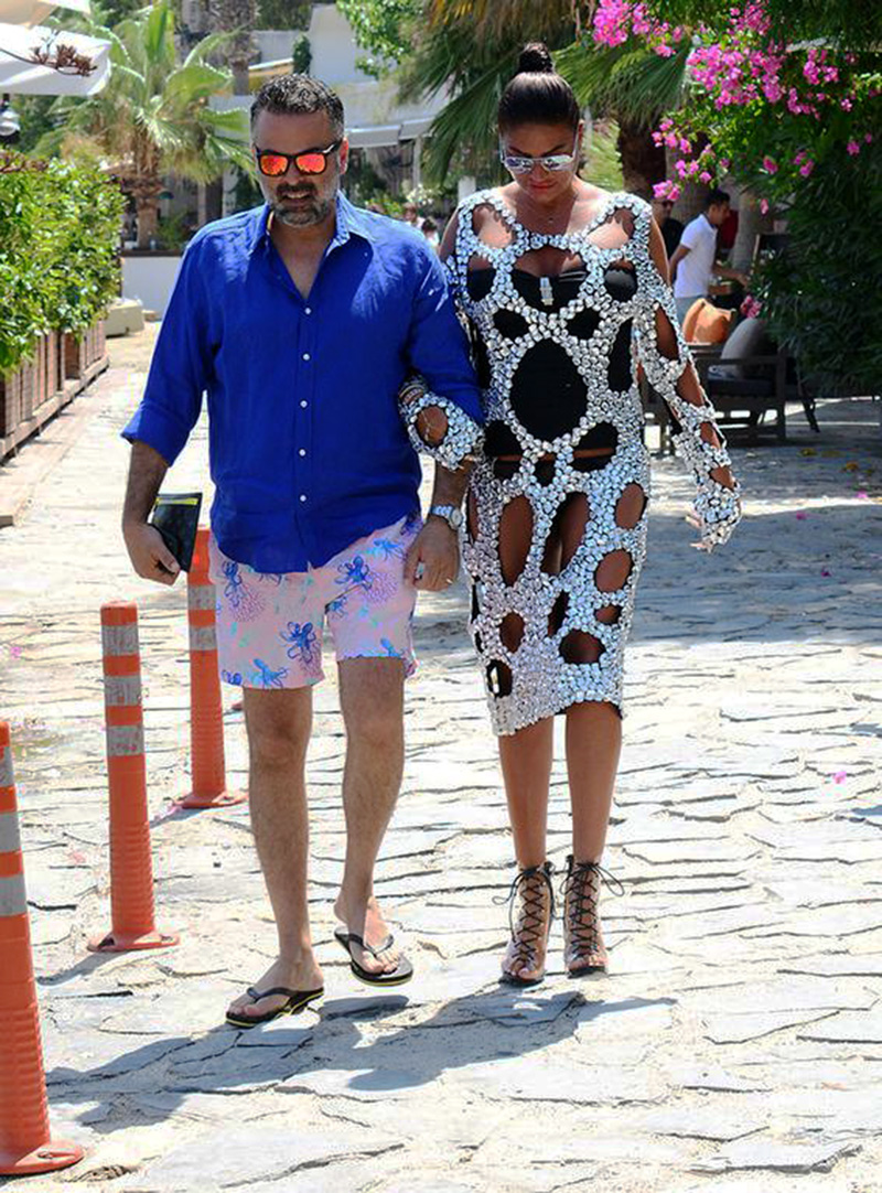 Bodrum Türkbükü’nde eşi ile tatil yapan sosyetik güzel Süreyya Yalçın, 7 kilo ağırlığındaki Swarovski taşlı plaj kıyafeti ve şeffaf topukluları ile yine dikkatleri üzerine çekti.