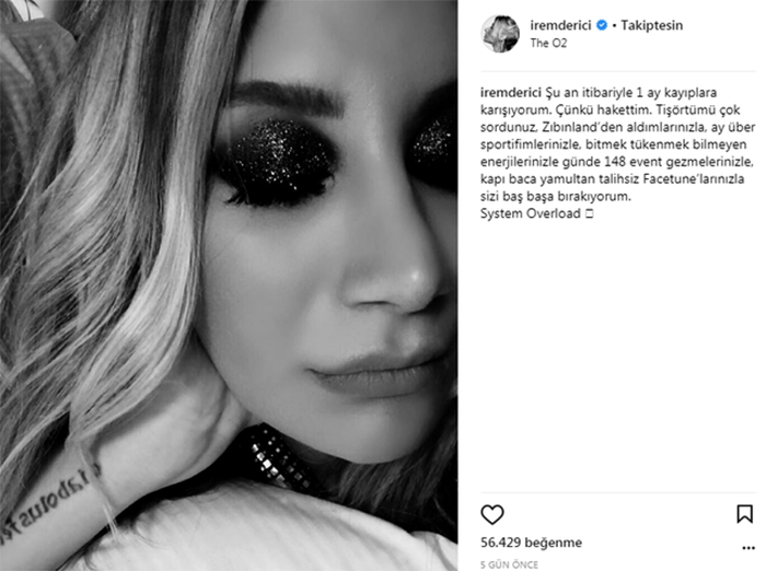 Söylentilerin kaynağı ise İrem Derici'nin sosyal medya hesabından paylaştığı mesaj oldu. Mesajında 1 ay kayıplara karışacağını söyleyen popçu ‘sistem aşırı yüklendi’ dedi.