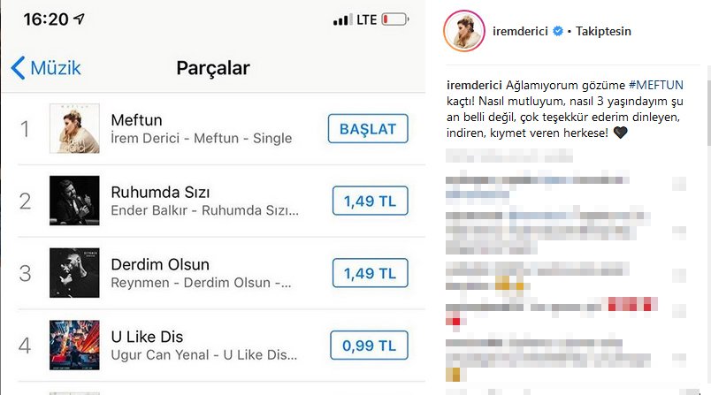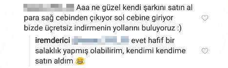 Şarkısının en çok indirilenler ve dinlenen şarkılar listesinde birinci sırada olduğuna dikkat çekmek isteyen Derici, bir takipçisinin ‘kendi şarkını dinlemek için para verip indirmişsin’ şeklindeki çıkışına ilginç bir yorum yaptı. İlk olarak “Ağlamıyorum gözüme MEFTUN kaçtı! Nasıl mutluyum, nasıl 3 yaşındayım şu an belli değil, çok teşekkür ederim dinleyen, indiren, kıymet veren herkese” notunu paylaşan Derici, dikkatli bir takipçisinin kendi şarkısı için para verdiğini hatırlatmasının üzerine şu diyalogu gerçekleştirdi.