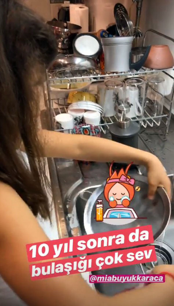 7 yaşındaki kızı bulaşık yıkarken onunla sohbet eden Işın Karaca, Mia’nın bulaşık yıkamaktan zevk aldığını öğrenince ondan bir söz almayı ihmal etmedi ve ‘bulaşık yıkamayı 10 yıl sonra da sevecek misin?’ diyerek son noktayı koydu.