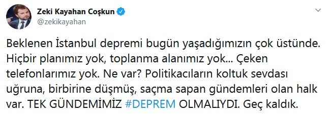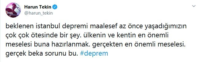 İstanbul'daki 5.8 şiddetindeki deprem ünlü isimleri de korkuttu. Harun Tekin, ülkenin en önemli meselesinin depreme hazırlanmak olduğunu söyleyerek, "Gerçek beka sorunu bu" dedi.